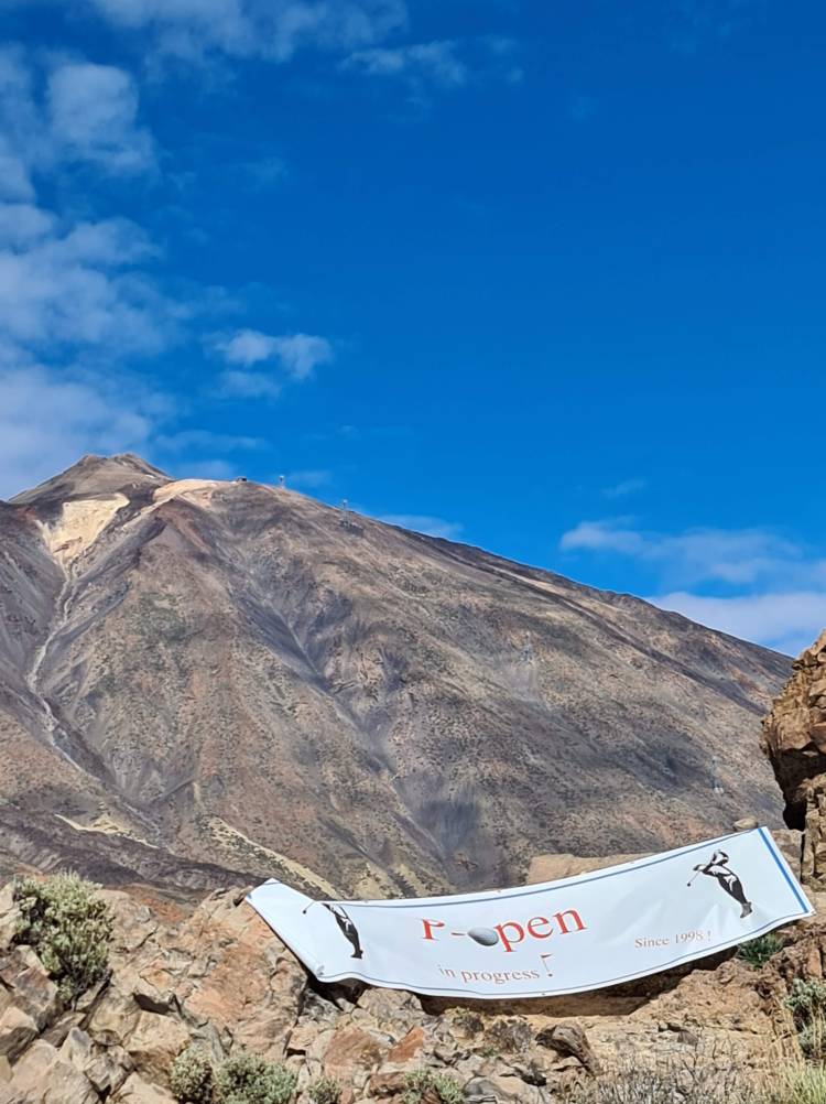 «Rudolf Gazolini» aka Espen fraktet spente deltakere og den alles stedsnærværende P-Open-banner’n opp til «base-camp» på ca. 2250 m.o.h. Det var prat om hvor fantastisk bilde av spillerne bak banner’n stående på toppen av Teide skulle bli. Den gang ei. Det en eneste haken ved reiseoperatørenes ellers prikkfrie opplegg var at det var krav om forhåndsbooking av billetter til cable-car til toppen. Det hadde ingen tenkt på så vi ble nødt å holde oss i «lavlandet» til å ta selfie med Teide i bakgrunnen. (Noe som var helt OK for de av deltakerne med høydeskrekk).